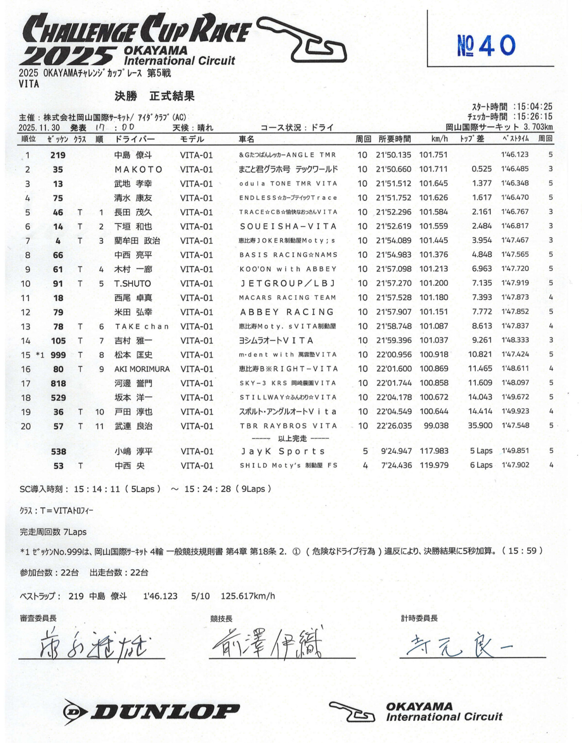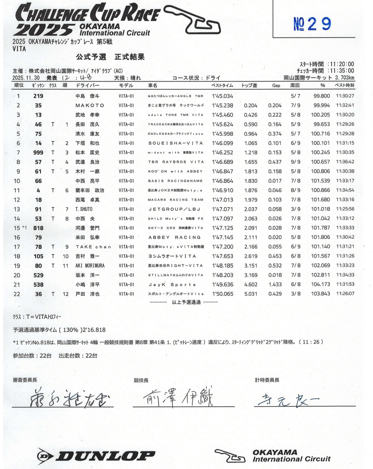前回のVITA of ASIAの2連戦で、すでに#77有岡綾平選手(山田車両Moty’s VITA制動屋)がチャンピオンを決めており、今回もエントリーはしていたものの、仕事の都合で欠場に。