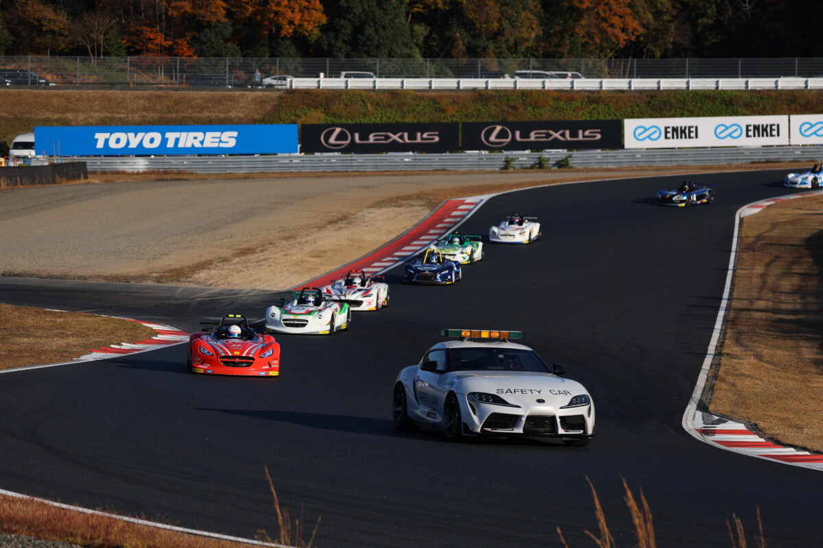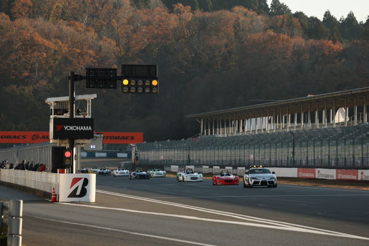 ほとんどの車両がすぐに走行を開始したが、#13武地孝幸選手(odula TONE TMR VITA)や#219 中島僚斗選手(&GたつばんレッカーANGLE TMR)を含む6台は、1分ほど経過してからピットを離れていく。