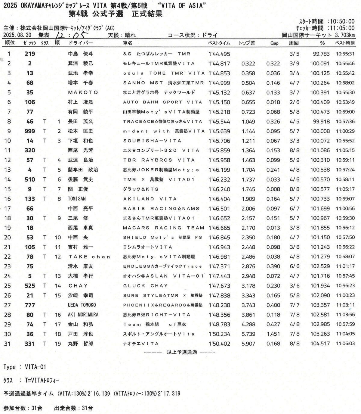今大会には当初33台がエントリー。その後2台がエントリーを取り消したため、予選には31台が出走した。